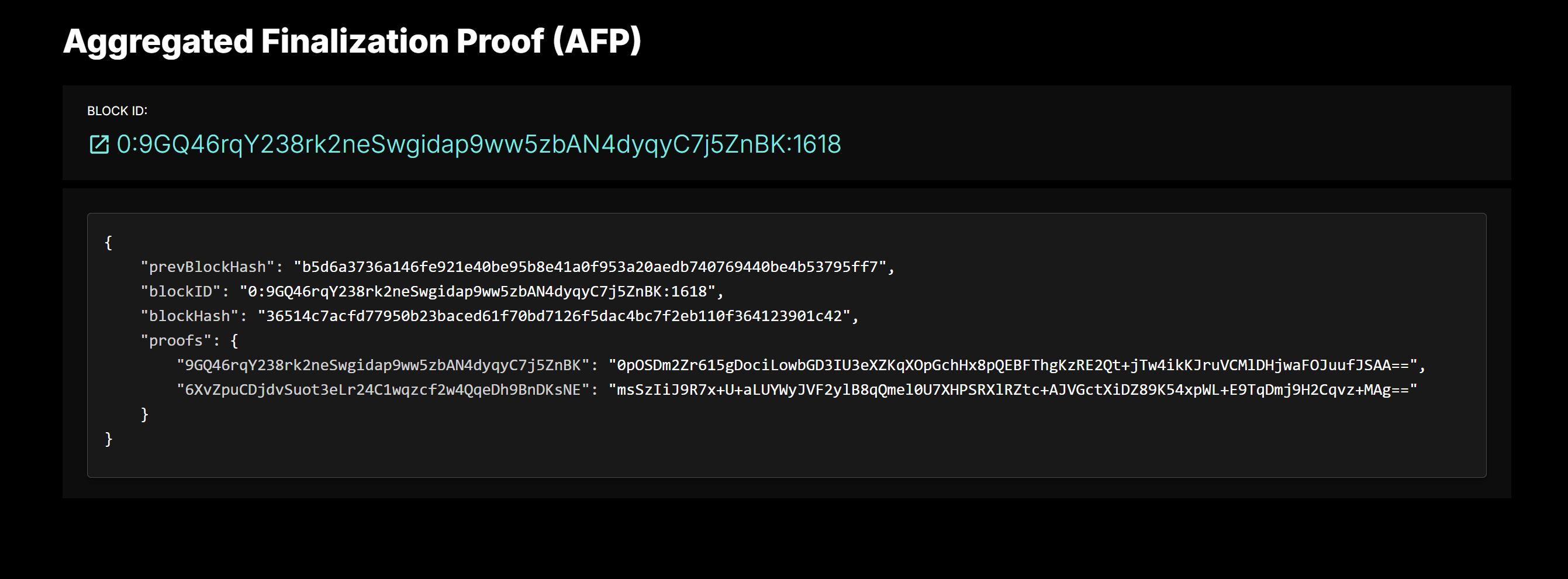 Probably the most interesting field here is `proofs` - these are just the FP's from the validators that are part of the quorum of the epoch when the block was generated.