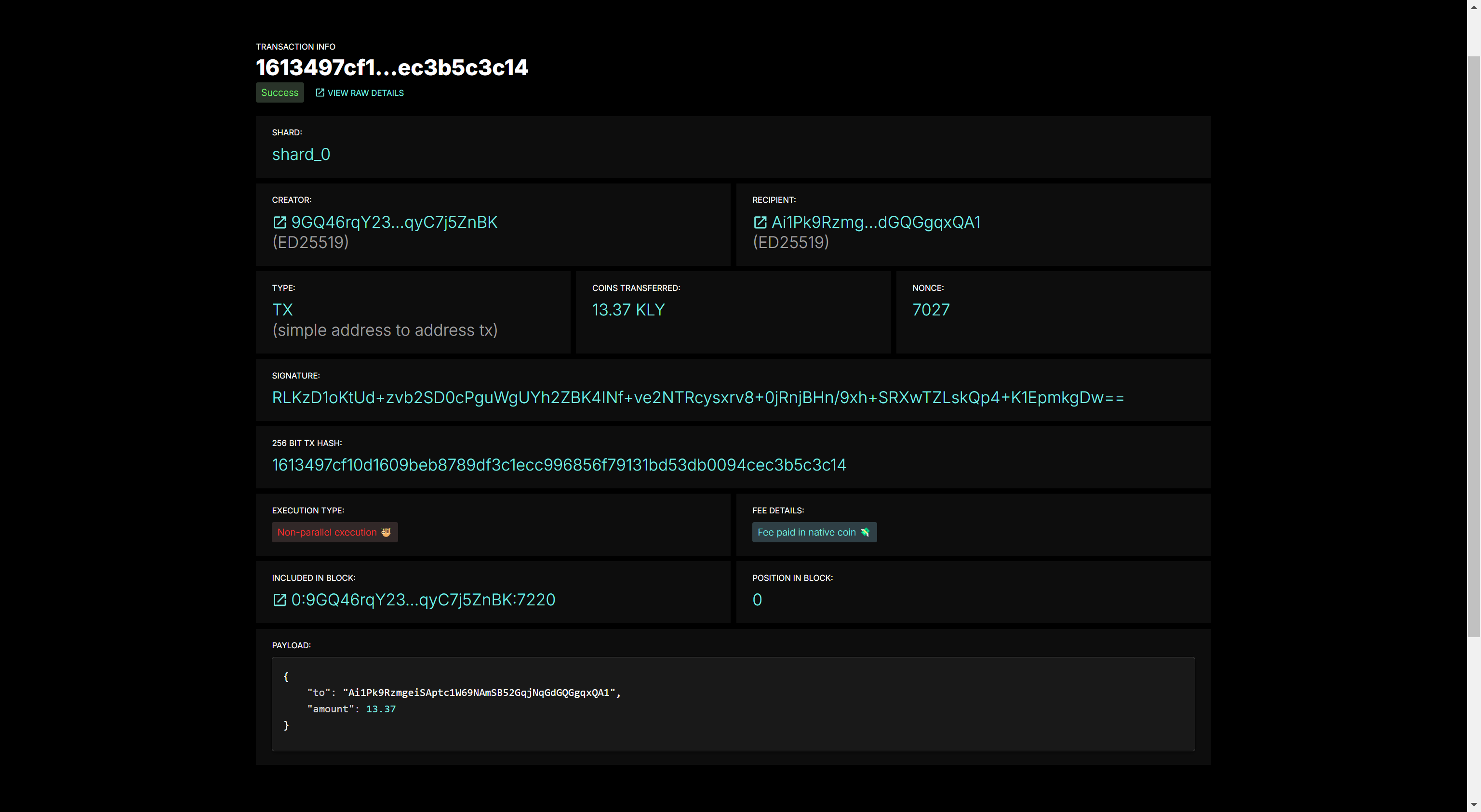 payload: { to: 'Ai1Pk9RzmgeiSAptc1W69NAmSB52GqjNqGdGQGgqxQA1', amount: '13370000000000000000' },